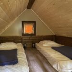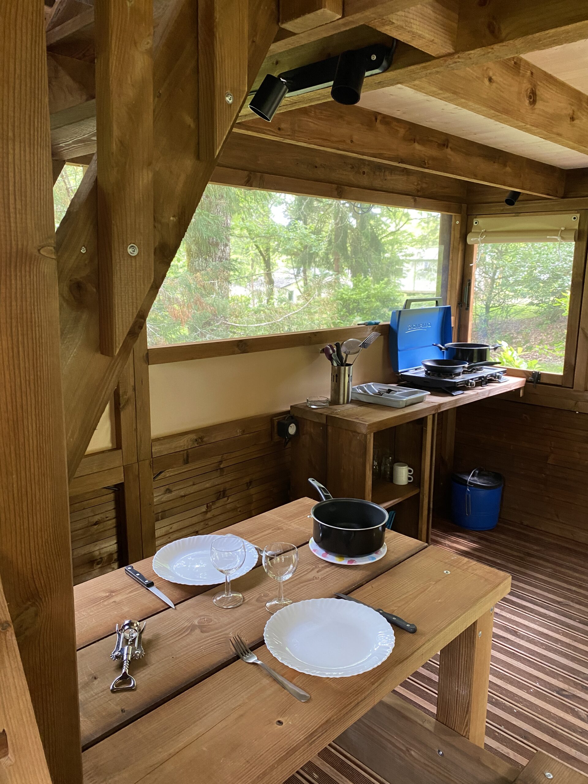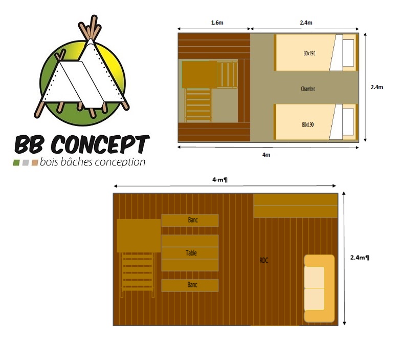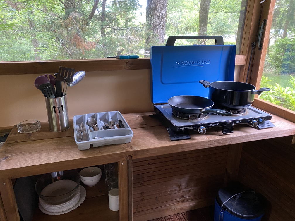 Vous y trouverez un espace de vie en partie basse avec le nécessaire pour cuisiner et un espace repas en bois et en partie supérieure la chambre avec espace de rangement.