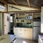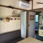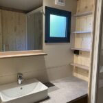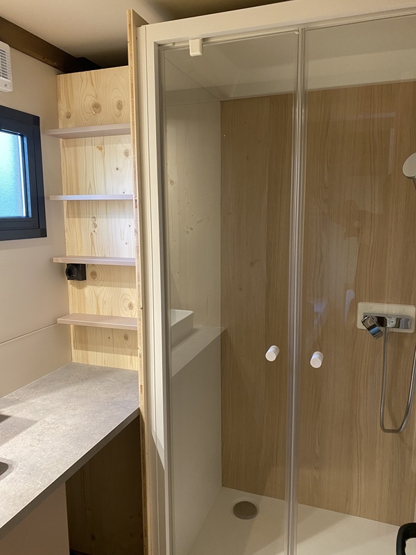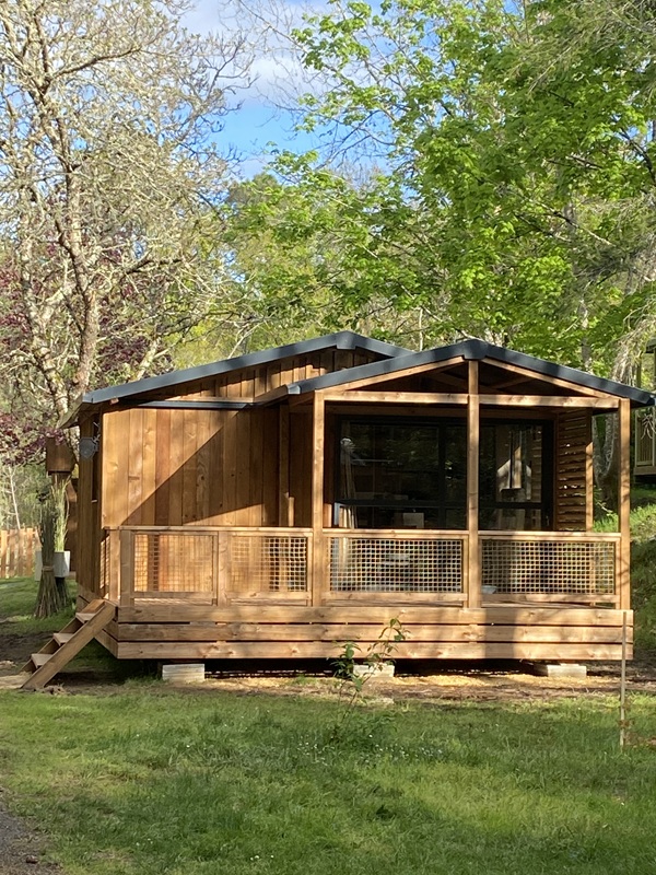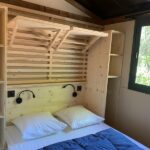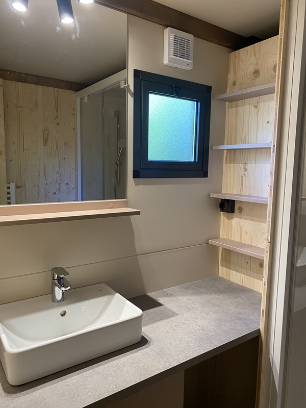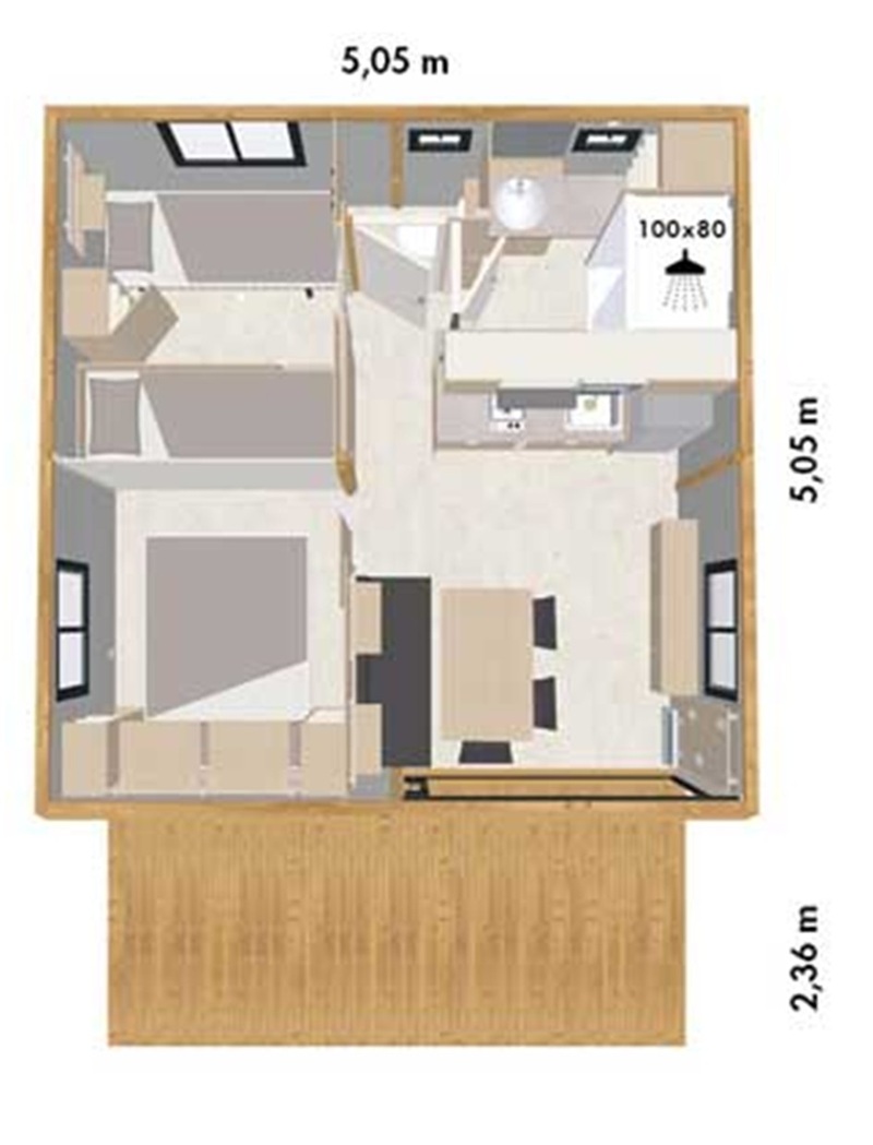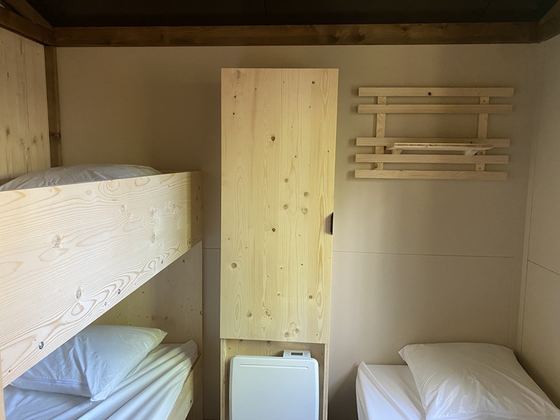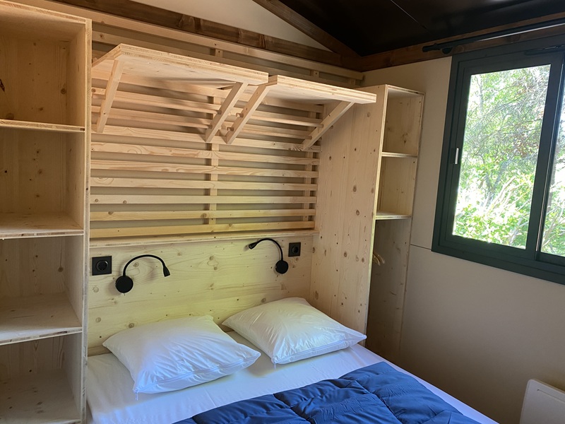 Ce chalet dispose de deux chambres indépendantes et peut accueillir jusqu’à cinq personnes. La baie vitrée en applique offre une grande ouverture de 2m40 et une vie dedans dehors très agréable.
